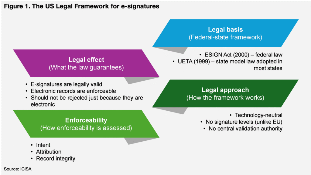 While ESIGN and UETA ensure legal validity and enforceability, they do not mandate universal acceptance. At the core of the US approach is a non-discrimination principle, meaning an electronic signature should not be denied legal effect solely because it is electronic, provided the parties have consented to the use of electronic signatures and the transaction falls within the scope of the legislation. The framework is technology-neutral and does not classify signatures by levels, unlike the EU’s eIDAS regime. Enforceability is therefore assessed individually, based on intent to sign, attribution, and the integrity and retention of the record (Figure 2).