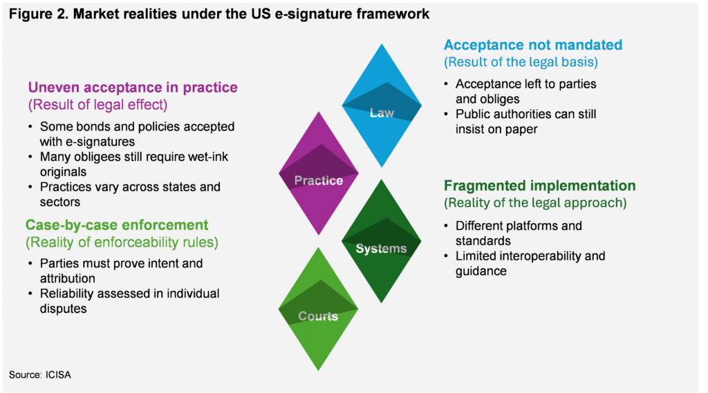 ESIGN and UETA apply broadly, including surety bonds and TCI documentation. The US system lacks a centralized validation framework, and there is no equivalent to the EU concept of qualified electronic signatures. This results in a limited regulatory role in mandating acceptance, leaving implementation largely to contractual terms and market practice. While e-signatures have been legally valid for over two decades, acceptance remains discretionary. This has led to fragmented adoption, with practices varying across states, public authorities, and project owners, despite the clear legal foundation (Figure 1).